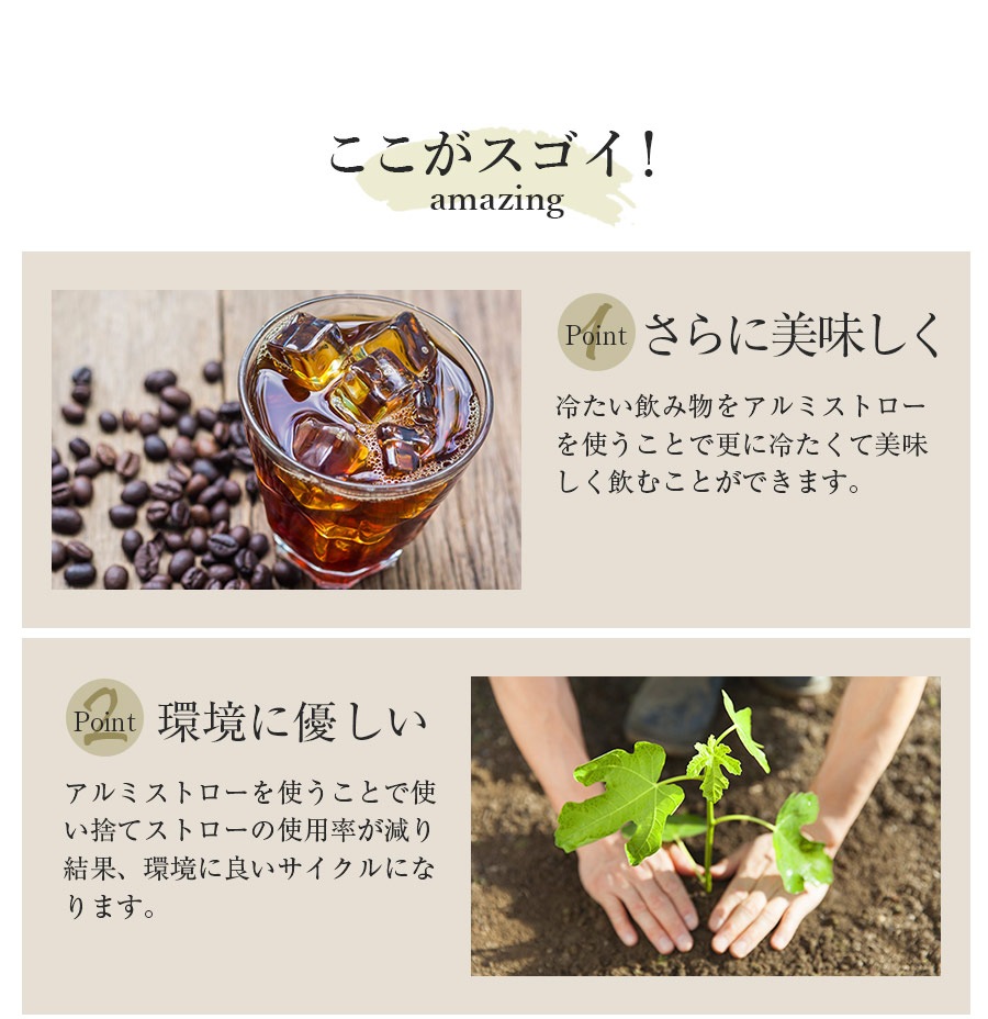 使い捨てのストローと違い、使い回しが可能です。また普段飲んでいる冷たい飲み物が更に冷たく美味しく飲めます!